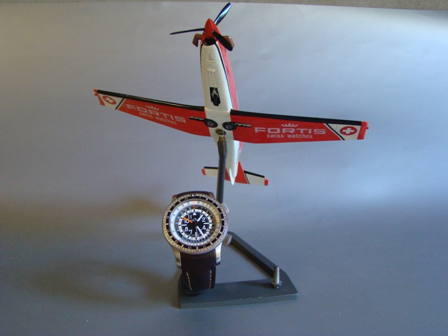 Proposta espositore, con aereo Pilatus PC-7 TEAM (Swiss Air Force) scala 1-43, abbinato a orologio Fortis (Swiss Watches) B-47 Calculator (Limited Edition).