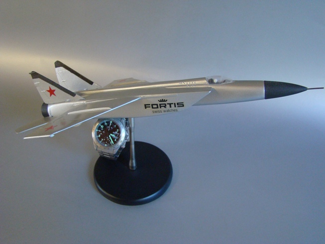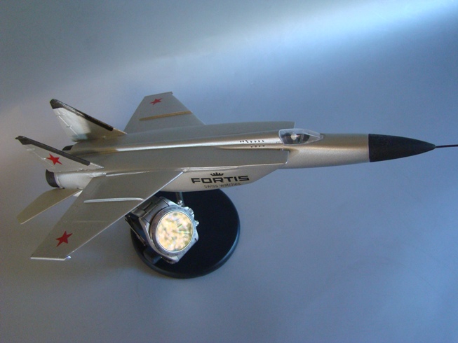 Proposta espositore, con aereo Mikoyan mig-25 ("Foxbat") scala 1-72, abbinato a orologio Fortis (Swiss Watches) Official Cosmonauts Chronograph (Automatico).