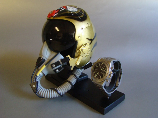 Proposta espositore, con Casco Pilota ("Tiger") scala 1-2, abbinato a orologio Fortis (Swiss Watches) Official Cosmonauts Chronograph (Automatico).